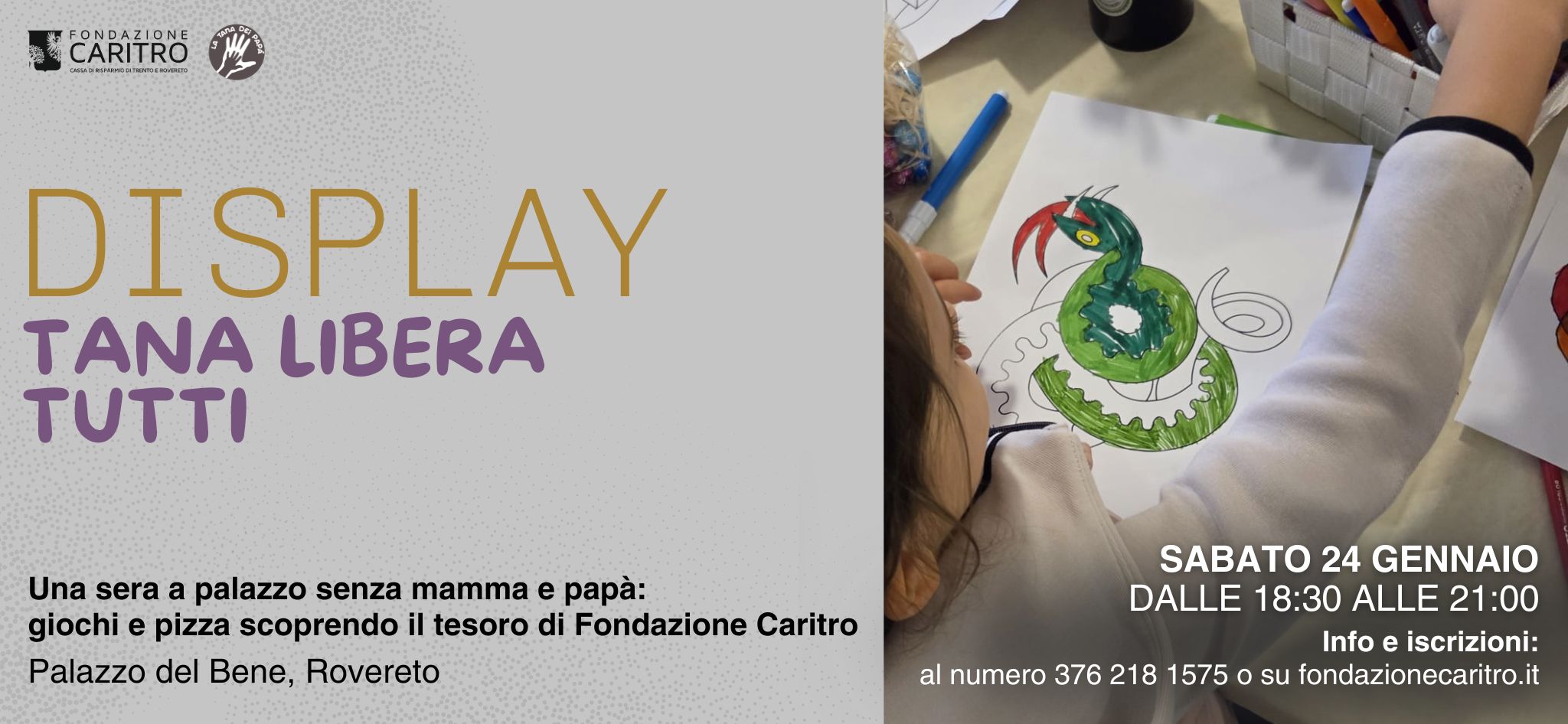 Mentre bimbe e bimbi partecipano a un laboratorio artistico e a una serata di giochi e cena insieme, gli adulti possono concedersi una serata libera. Prima di salutarci sarà possibile, per i genitori, fare una visita a DISPLAY per scoprire la Collezione d’Arte di Fondazione Caritro attraverso un percorso immersivo.
